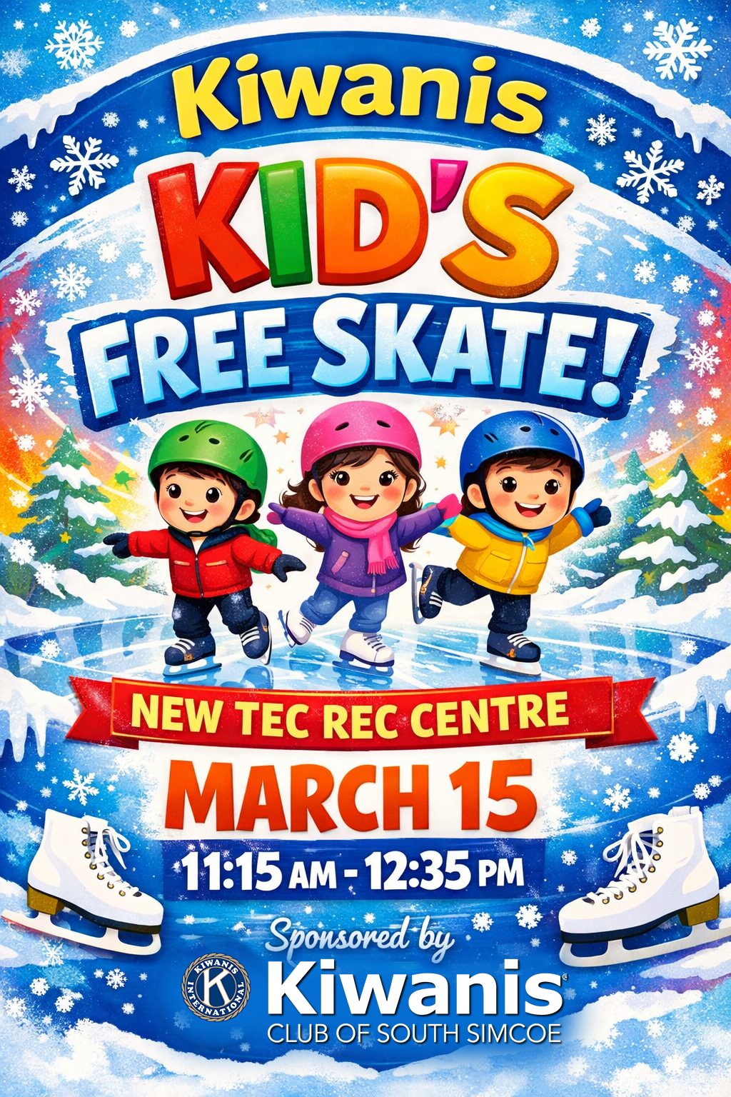 Join us on March 15 from 11:15 am to 12:35 am for a free skate at theNew Tec Rec Centre.We’ll see you there!