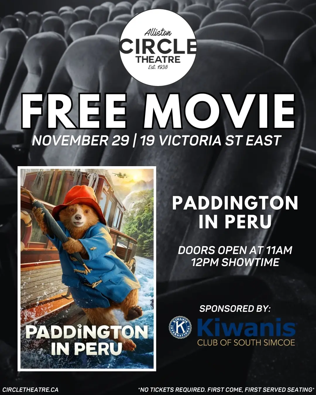 We’ll see you at 12:00 p.m. on Saturday November 29th at the Circle Theater on VICTORIA ST. in downtown Alliston for our free-to-you movie experience.